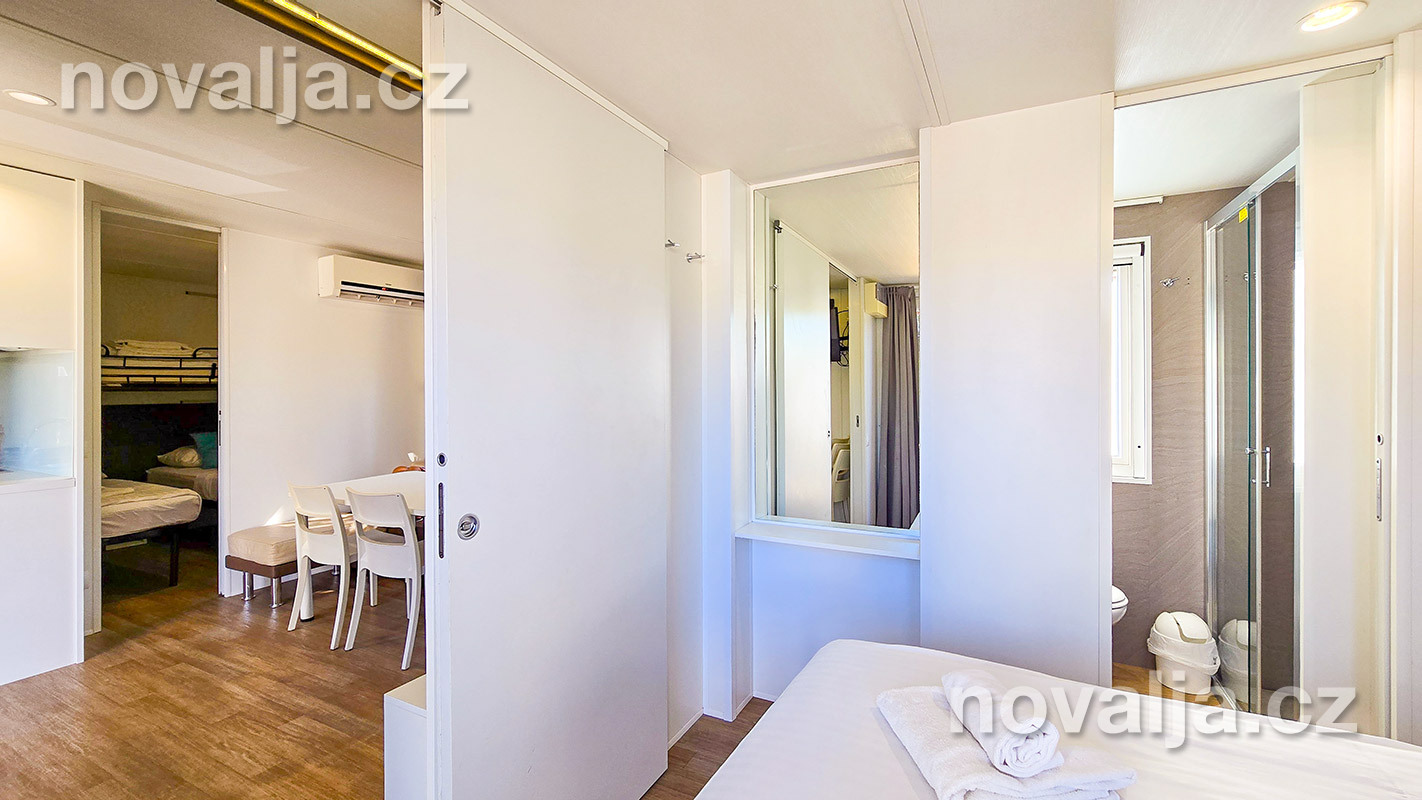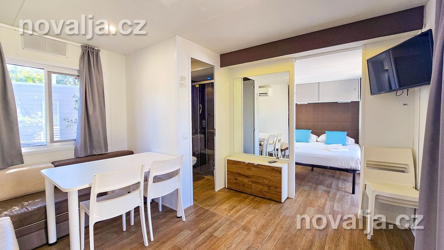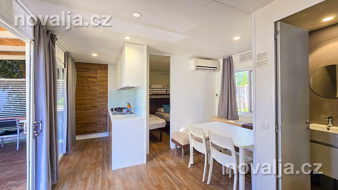 3 ložnice se dvěma lůžky - v jedné ložnici manželská postel, ve zbývajících dvou vždy dvě samostatná lůžka, vybavená kuchyň (varná deska, lednička, mrazák, mikrovlnná trouba, varná konvice, kávovar) s rozkládacím gaučem pro 1 osobu, TV+SAT, 2x koupelna se sprchovým koutem a WC, stíněná terasa se zahradním nábytkem a dvěma lehátky. Klimatizace v kuchyni (v ceně). Rozloha 34 m² + terasa 26 m².