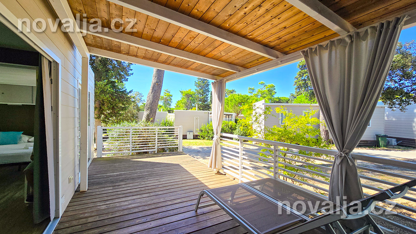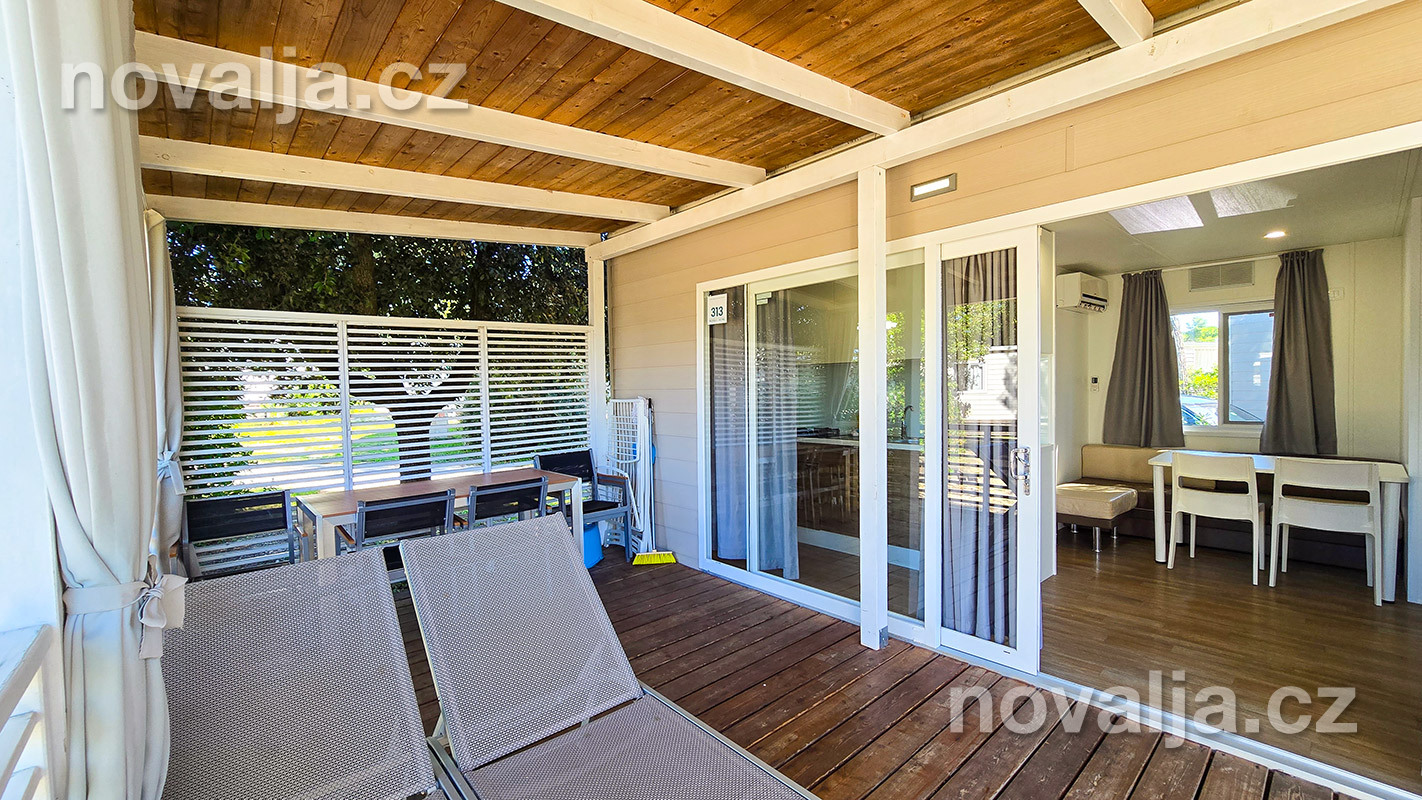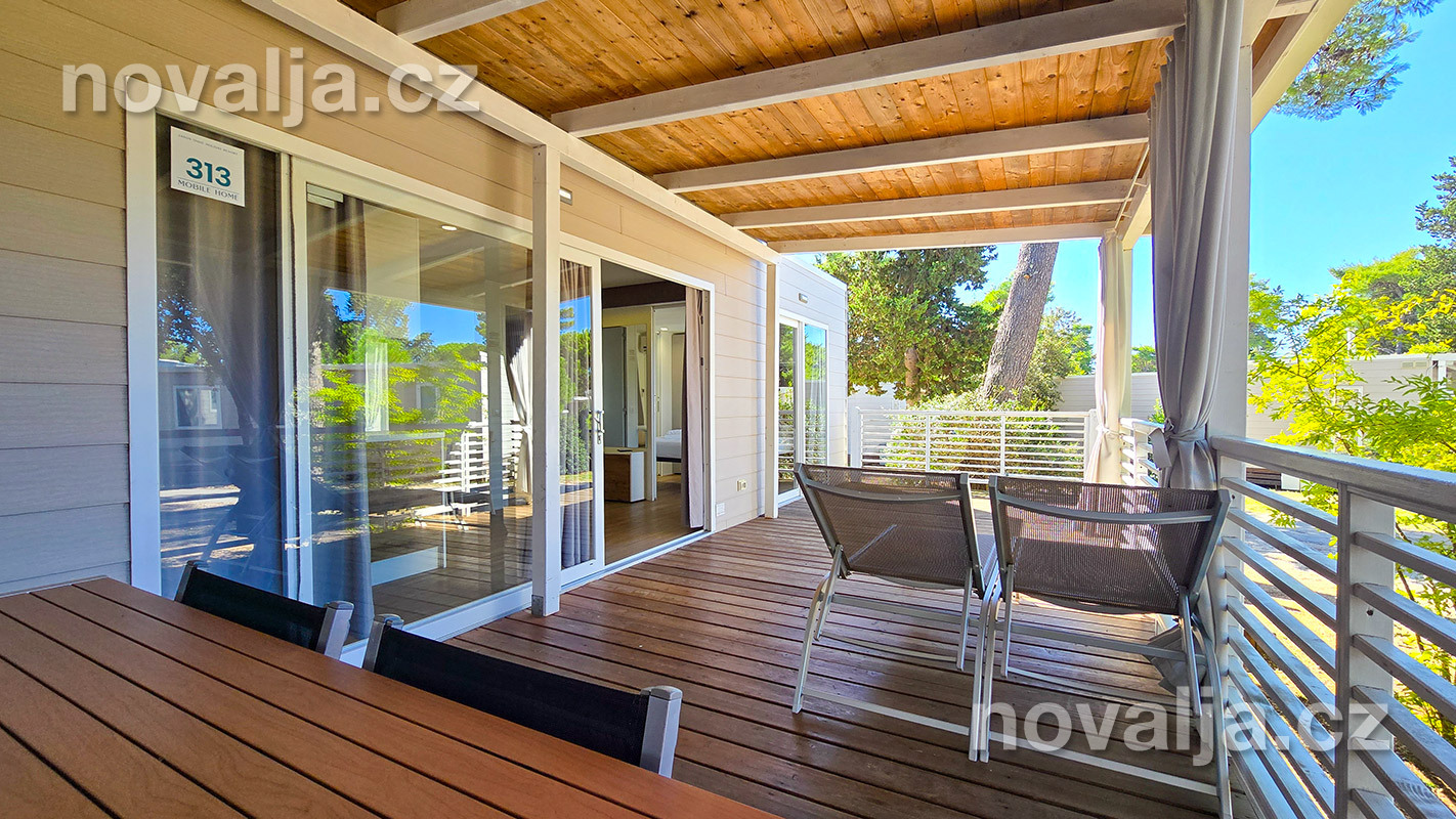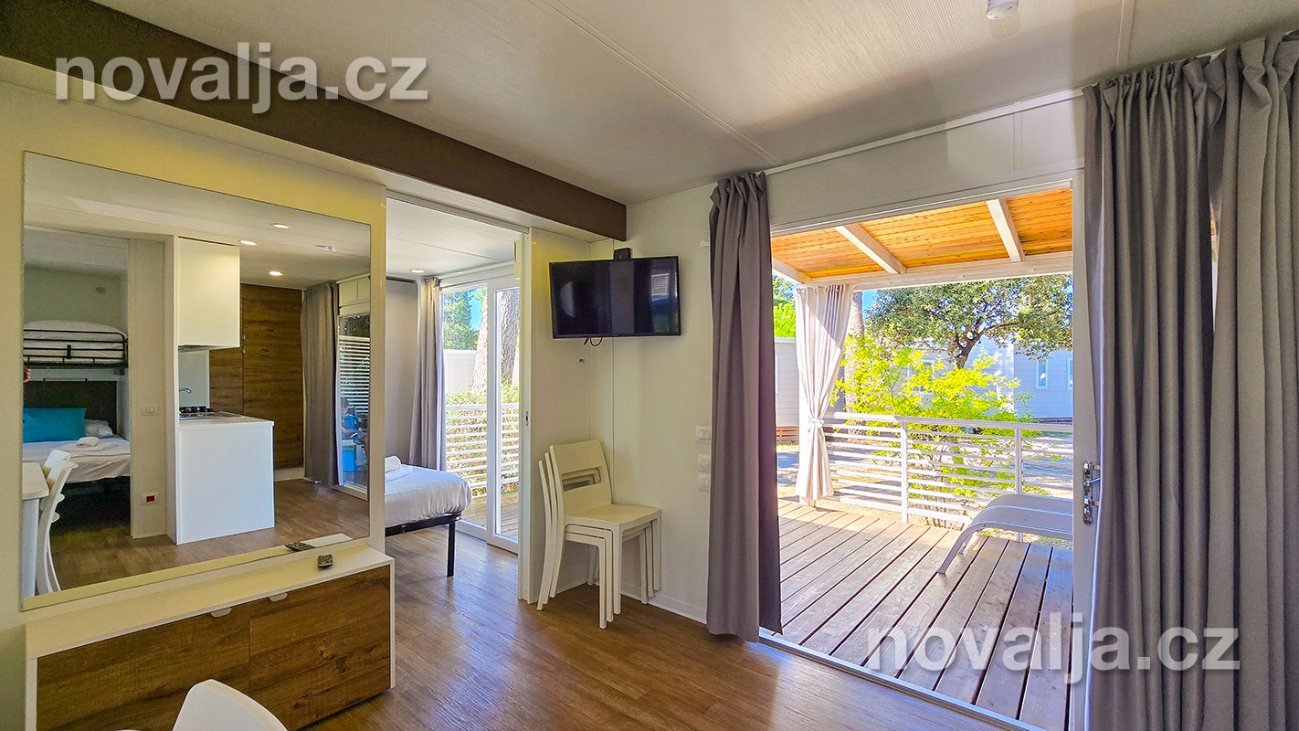 3 ložnice se dvěma lůžky - v jedné ložnici manželská postel, ve zbývajících dvou vždy dvě samostatná lůžka, vybavená kuchyň (varná deska, lednička, mrazák, mikrovlnná trouba, varná konvice, kávovar) s rozkládacím gaučem pro 1 osobu, TV+SAT, 2x koupelna se sprchovým koutem a WC, stíněná terasa se zahradním nábytkem a dvěma lehátky. Klimatizace v kuchyni (v ceně). Rozloha 34 m² + terasa 26 m².