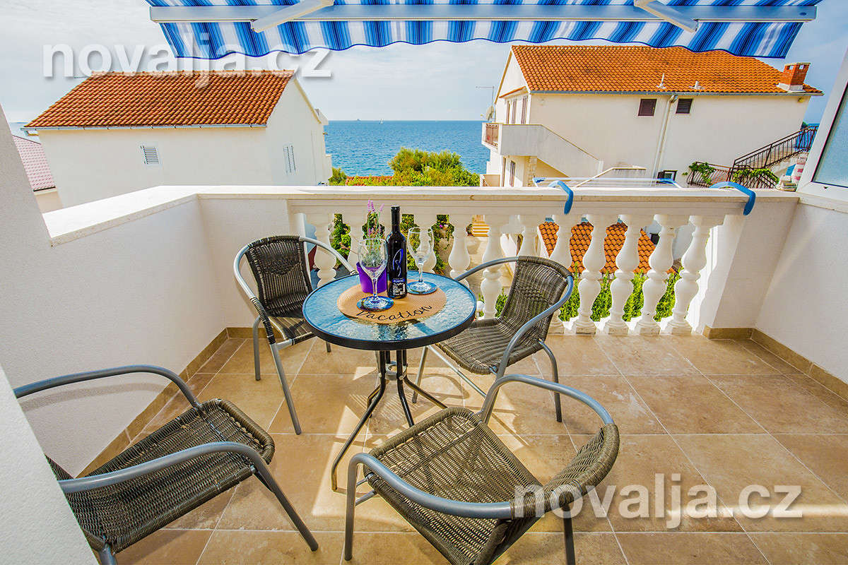 2 ložnice - každá se dvěma lůžky, vybavená kuchyň (lednička, mrazák, mikrovlnná trouba, varná konvice) s rozkládacím gaučem (200 x 152 cm) pro 1 osobu, TV+SAT, sociální zařízení se sprchovým koutem a WC, pračka, fén, terasa a balkón s výhledem na moře. Klimatizace v kuchyni (v ceně).