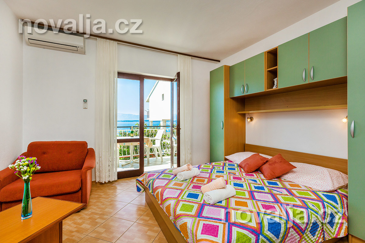 Studio (jedna místnost) se dvěma lůžky a rozkládacím gaučem (190 x 115 cm) pro 1 osobu, vybavený kuchyňský kout (lednička, mrazák, varná konvice, mikrovlnná trouba), TV+SAT, sociální zařízení se sprchovým koutem a WC, terasa s výhledem na moře. Klimatizace (v ceně).