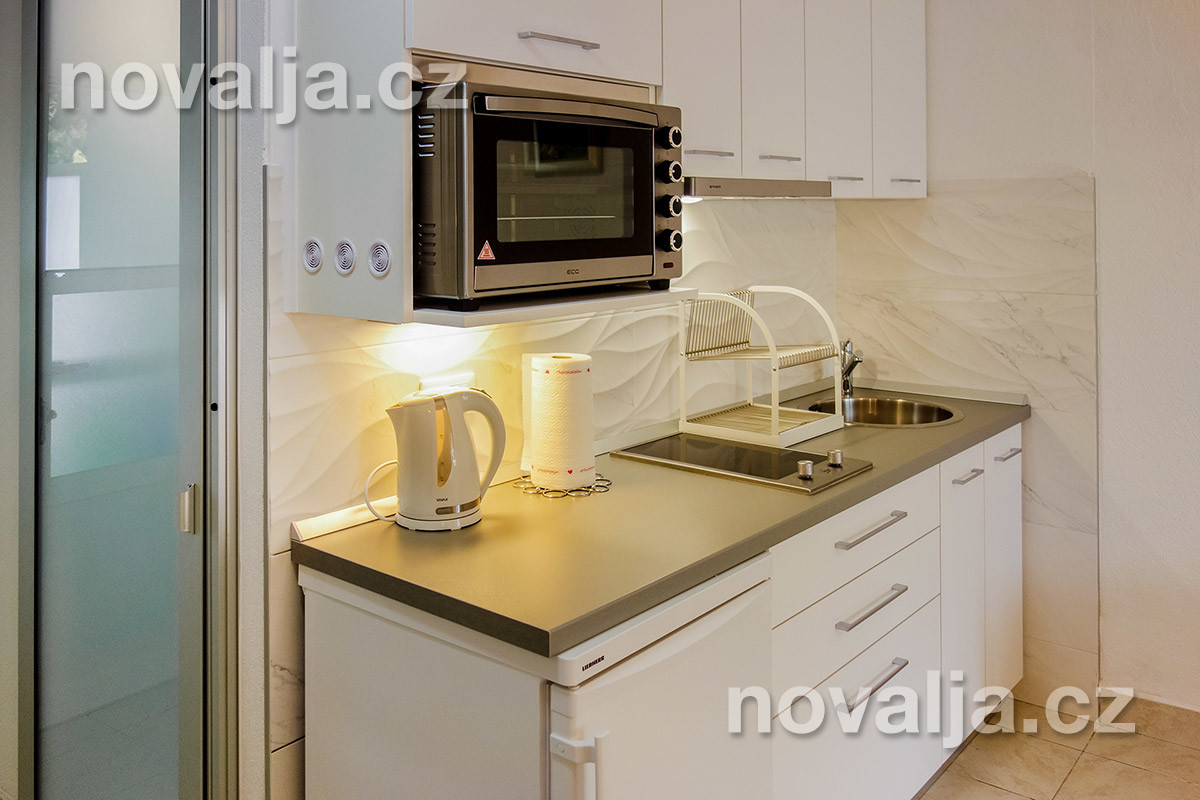 Studio (jedna místnost) se dvěma lůžky a rozkládacím křeslem pro 1 osobu, vybavený kuchyňský kout (lednička, trouba, varná konvice, toaster), TV+SAT, sociální zařízení se sprchovým koutem a WC, fén, terasa s vlastním grilem. Klimatizace (v ceně).