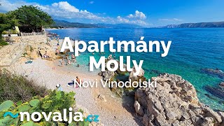 Apartmánový dům Molly se nachází v klidném letovisku Novi Vinodolski na Crikvenické riviéře, necelý 1 km od historického centra. Oblázková pláž s pozvolným vstupem do moře je 290 m od domu. Předností domu je krásná zahrada s ovocnými stromy.